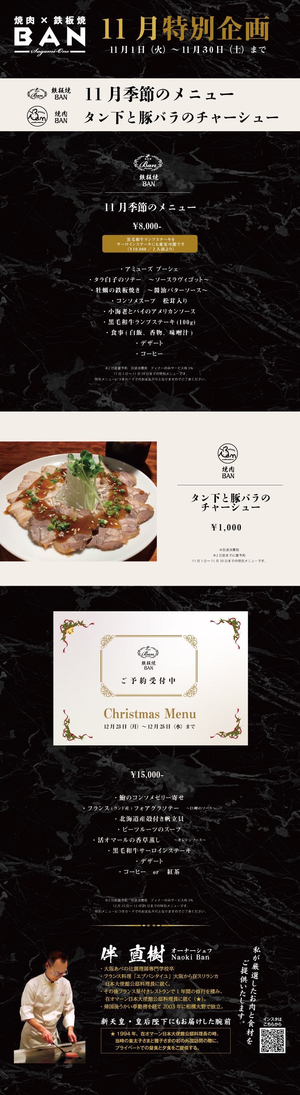 Home おすすめ料理, お知らせ 11月特別企画 11月特別企画 2019.11.1 おすすめ料理、お知らせ 11月限定メニューのお知らせです。 11/1~11/30までの特別メニューとして、 「タン下と豚バラのチャーシュー」が登場します。 冬のはじまり!お肉が美味しい季節です! ぜひ焼肉BANでスタミナをつけましょう! 詳細は下記画像をご覧ください。 Tweet Share +1 Hatena RSS